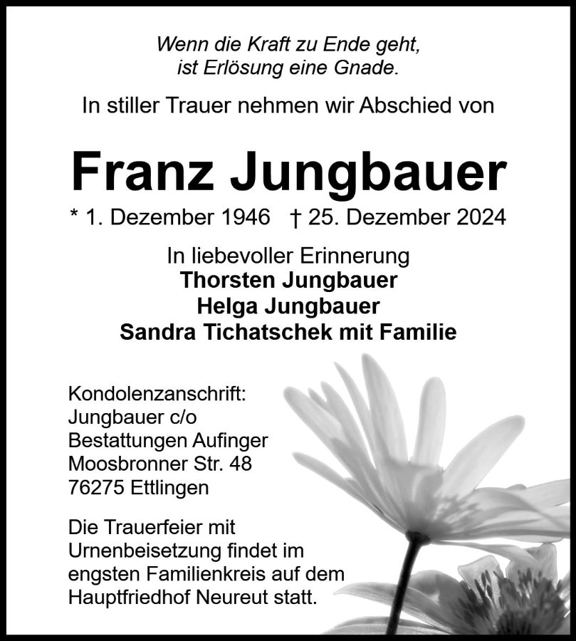 Im Namen der Schulkameradinnen und Schulkameraden von Franz, wollen wir den Hinterbliebenen unser aufrichtiges Beileid aussprechen und ihnen viel Kraft wünschen.